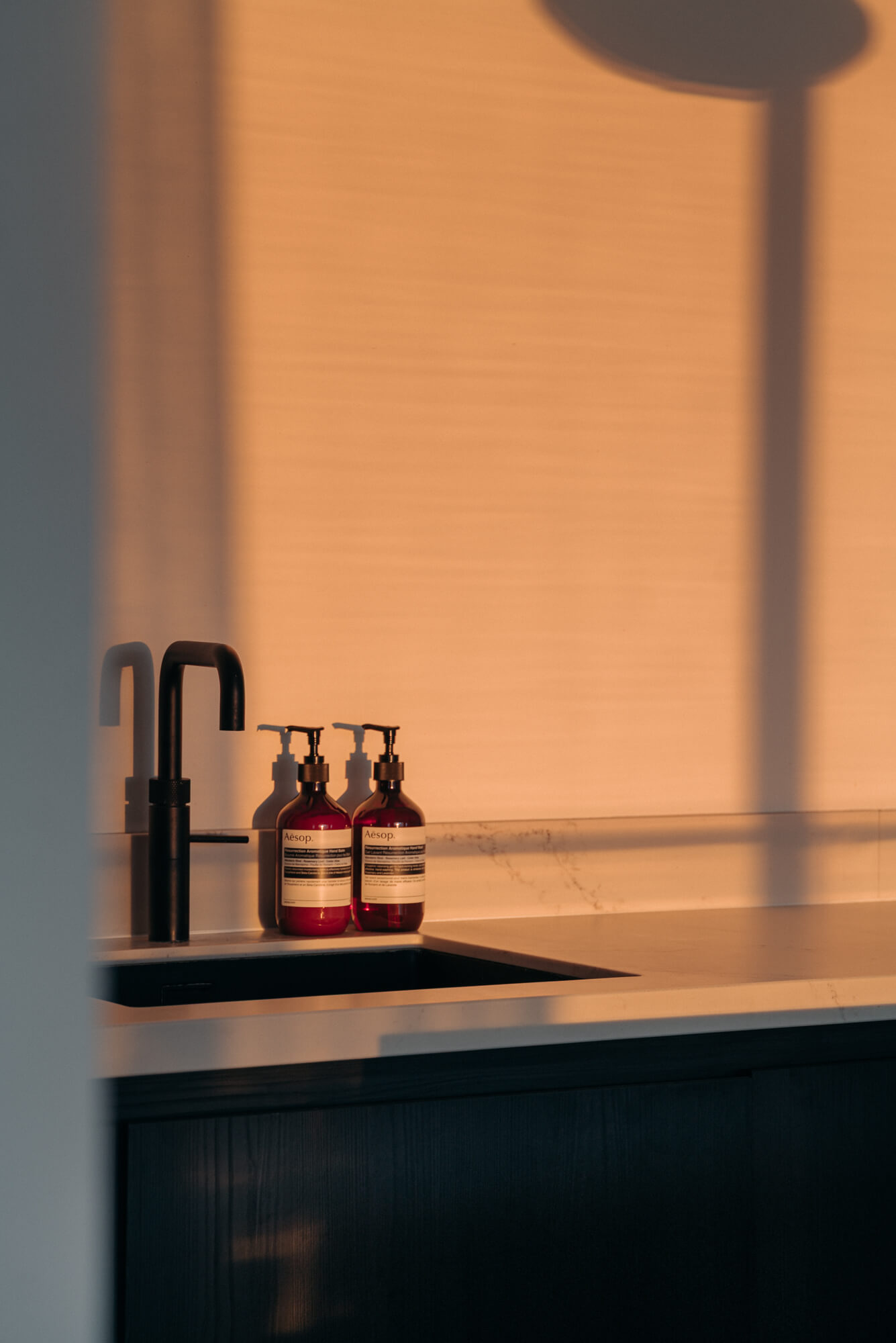 A project featuring a Lion Stone composite countertop and black kitchen cabinets that contrast beautifully with light walls and ceilings. The high ceilings enhance the sense of space, while stainless steel stools and a coffee machine add a bold, industrial touch. Finished with dark herringbone flooring and classic wall mouldings for a refined edge.