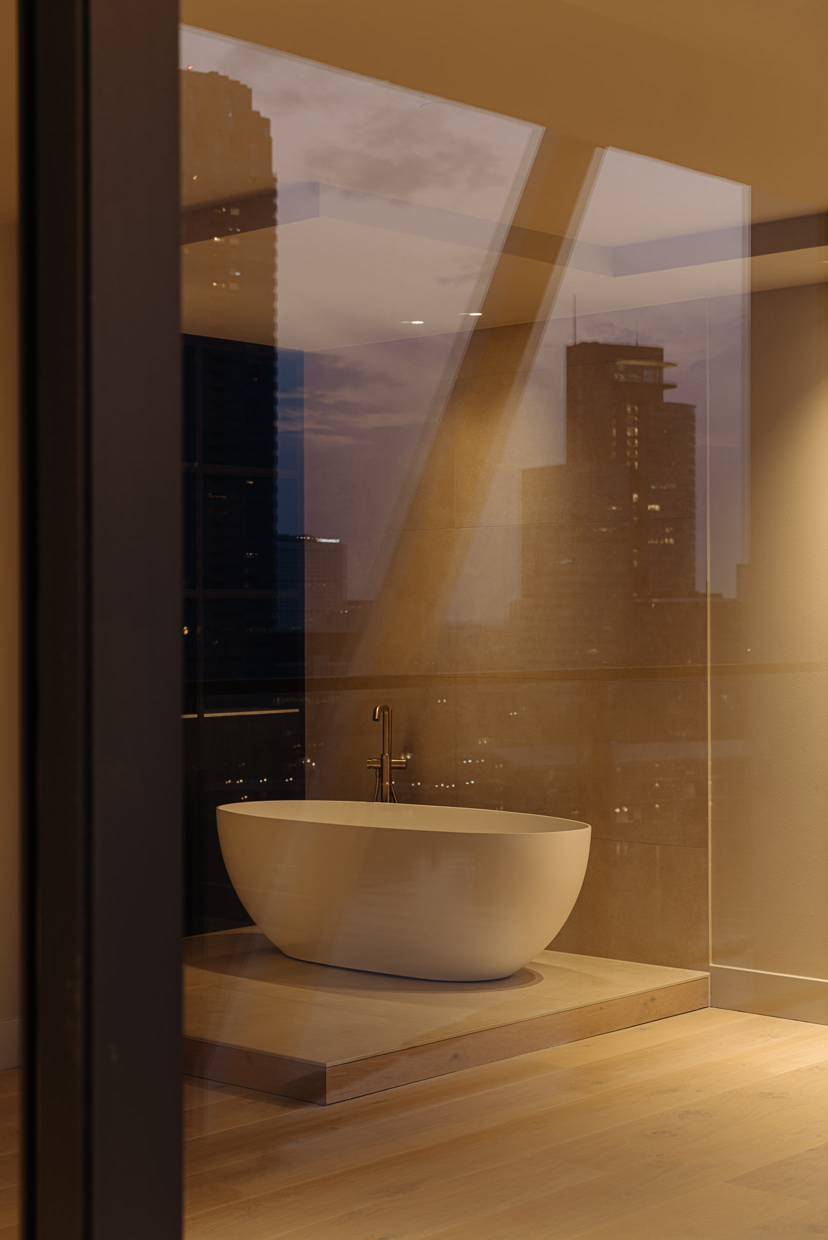 For this model home, we chose a dark wood finish for the pivot doors, echoed in the custom-made furniture throughout the space. Wall lighting by Bocci and a striking pendant by Jacco Maris add character and warmth. The kitchen features Dekton Rem Natural by Cosentino and wide, straight oak floorboards that enhance the clean and spacious feel.